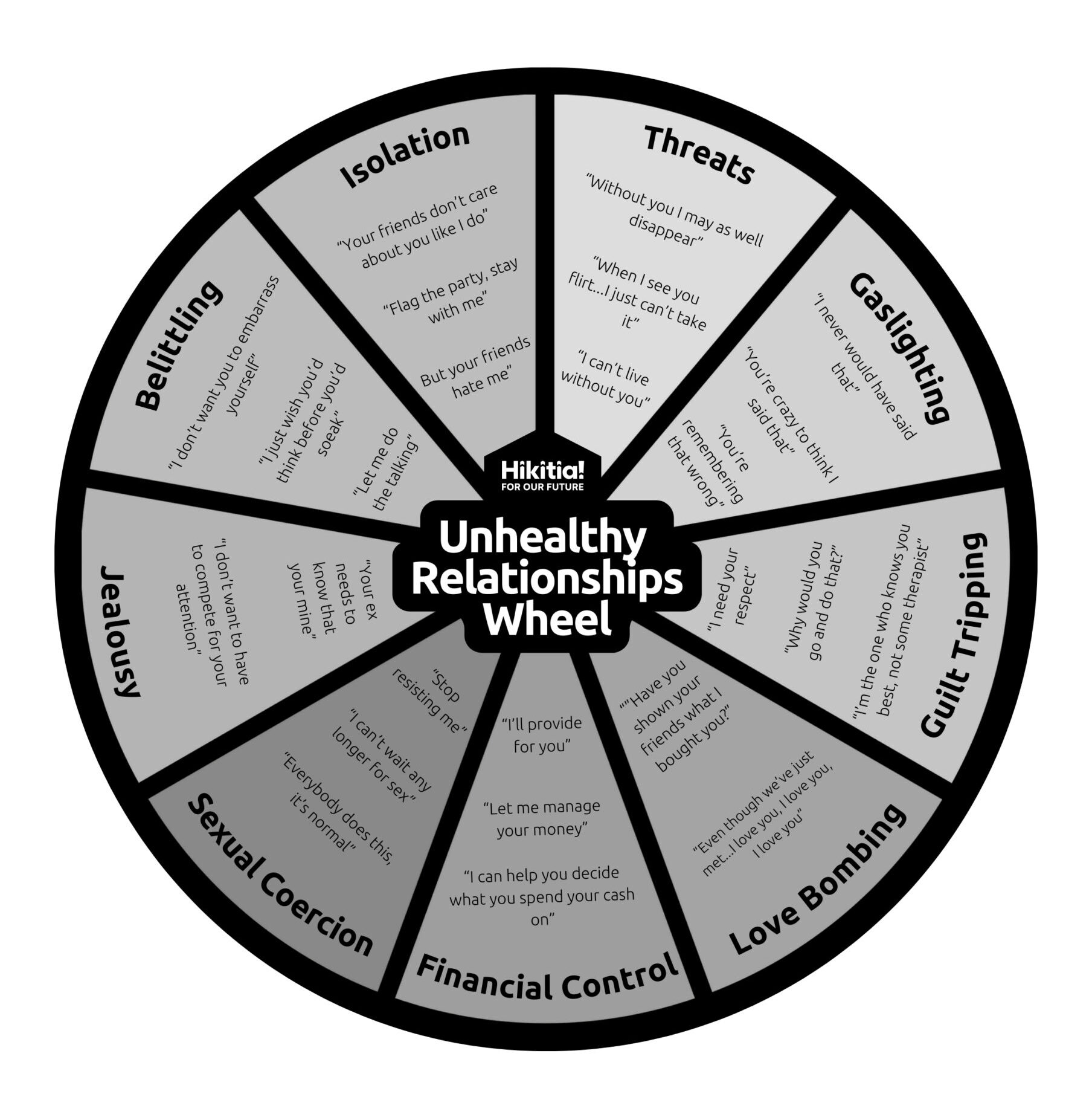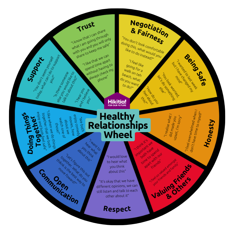 This healthy relationship wheel shows the behaviours we deserve to have in all of our relationships. It shows some examples of what these behaviours might sound or look like in a relationship. In a healthy relationship, we feel values and respected. We are listened to and have a safe space to openly express how we feel. Healthy relationships are mutual and equal. You can find out more by connecting to this resource from Healthify – He Puna Waiora